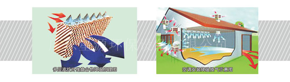 用循环水泵不间断地把水槽内的水提升,并通过布水系统均匀地喷淋在蒸发过滤层上(水帘即多层波纹纤维叠合物),室外热空气在风机的作用下进入蒸发降温介质,