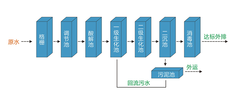 生活污水处理一般采用先进成熟的A/O+MBR污水处理工艺,该工艺相对于传统工艺突出特点是出水稳定,受季节性影响小,处理设备占地面积大大减少,加之池中填充新型弹性立体填料,大大优化微生物组成结构与数量,提高整个系统有机物负荷,克服了传统推流式工艺抗冲击负荷能力不强的问题,大大降低污泥产泥量,从而使废水稳定达标排放。