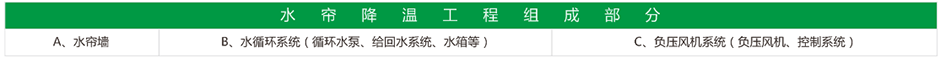 水帘降温工程由负压风机和水帘墙两大部分构成,降温区域一面安装负压风机,另外一面安装水帘循环系统。循环水泵不间断地把水箱内的水提升,并通过布水系统均匀地喷淋在蒸发过滤层上,(湿帘即多层波纹纤维叠合物),保持湿帘一直湿润。当对面负压风机开启时使室内产生负压,迫使空气从水帘一面进入,在经过水帘的时候由于水蒸发吸热,空气的温度下降,从而使进入到室内空气温度下降,整个区域内达到降温的效果。
