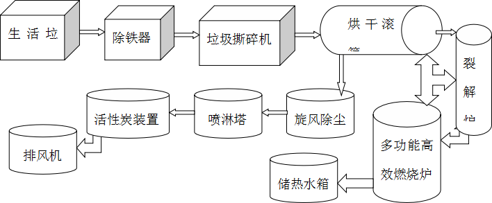 工艺过程说明:垃圾原料经过上料皮带传输进行除铁器后,再经输送机送入撕碎机料斗→由撕碎机皮带输送进入烘干滚简装置→然后再输送进入垃圾裂解气化炉→欠氧高温裂解为燃气→灰渣通过排渣系统排出(可作为建材辅料)→可燃气体由燃气高温引风机引入多功能高效炉燃烧炉产生高温烟气→一部分烟气由锅炉引风抽入垃圾裂解炉热回收利用,另外大部分热源进入垃圾烘干滚简对湿垃圾进行烘烤→水蒸汽和粉尘及臭气进入废气系统净化处理达标排放。