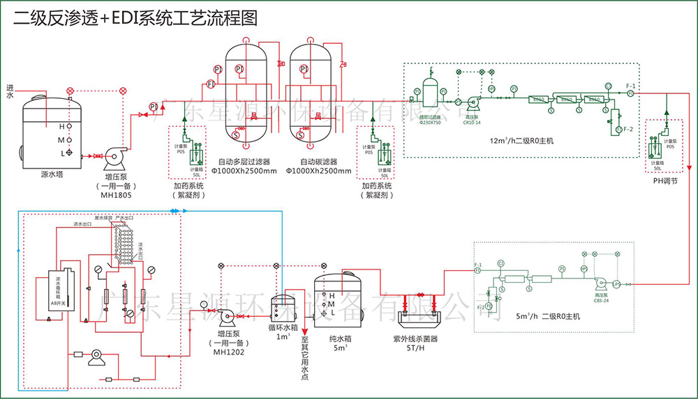 通过离子交换树脂及选择性离子膜达到高脱盐效果,与反渗透结合的联合工艺使产水水质可达10 ~15MΩ-cm的高规格产水。